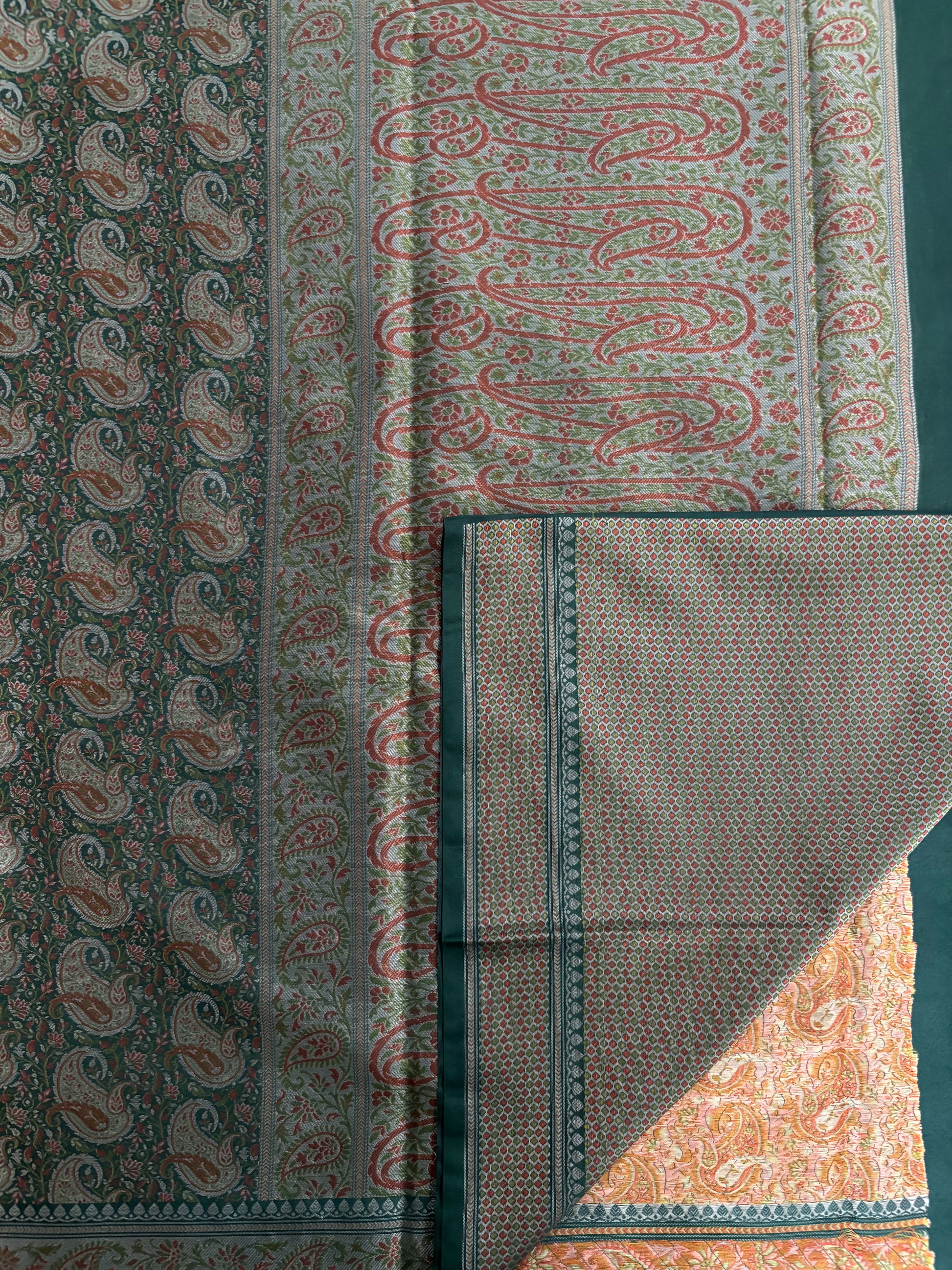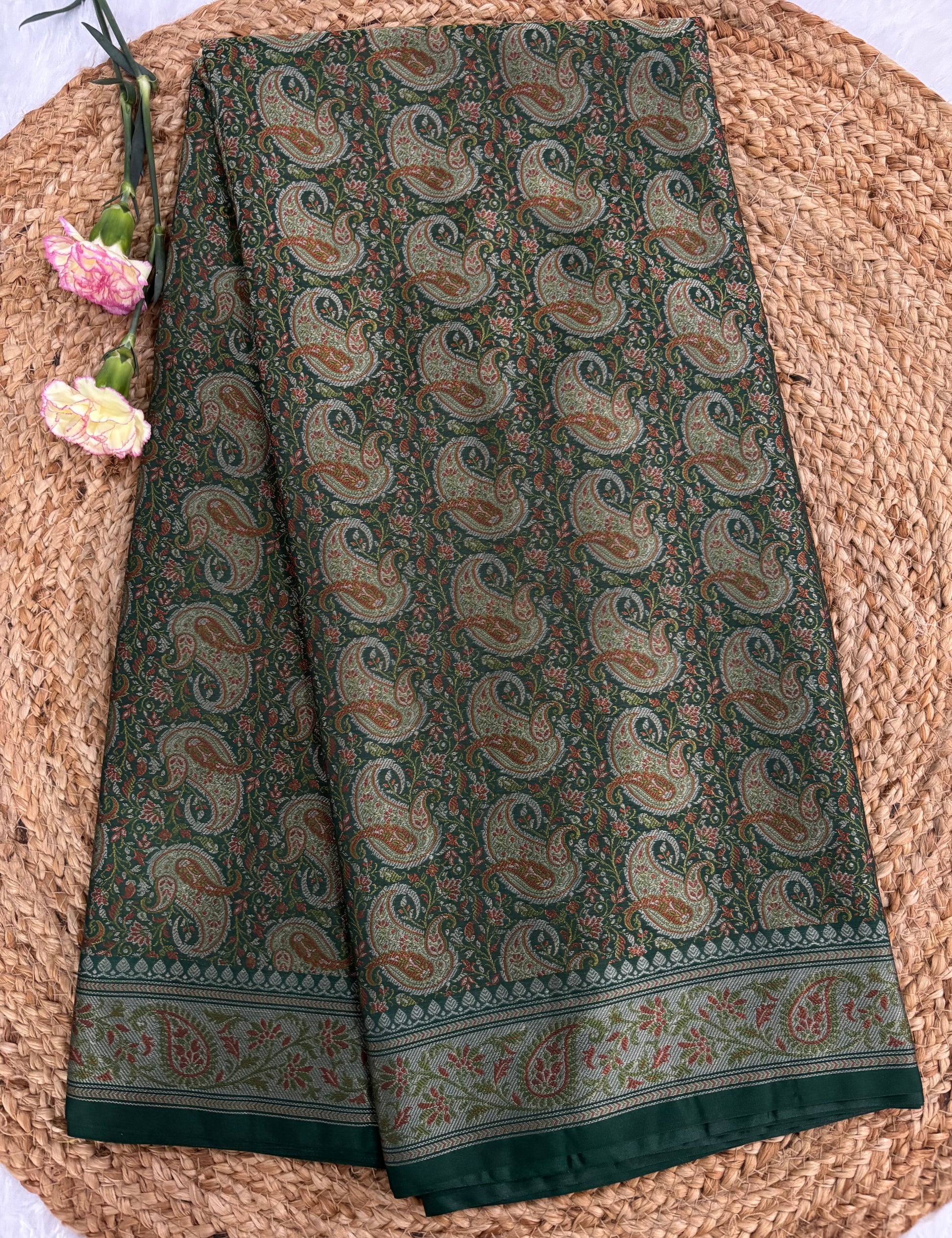 Elevate your ethnic wardrobe with this stunning Bottle green pashmina silk saree, featuring intricately woven mango motifs throughout the fabric. Delicate woven borders frame the drape beautifully, while the ornate pallu adds a graceful finishing touch that commands attention. The luxurious pashmina silk is perfect for weddings, festivals, and special occasions.