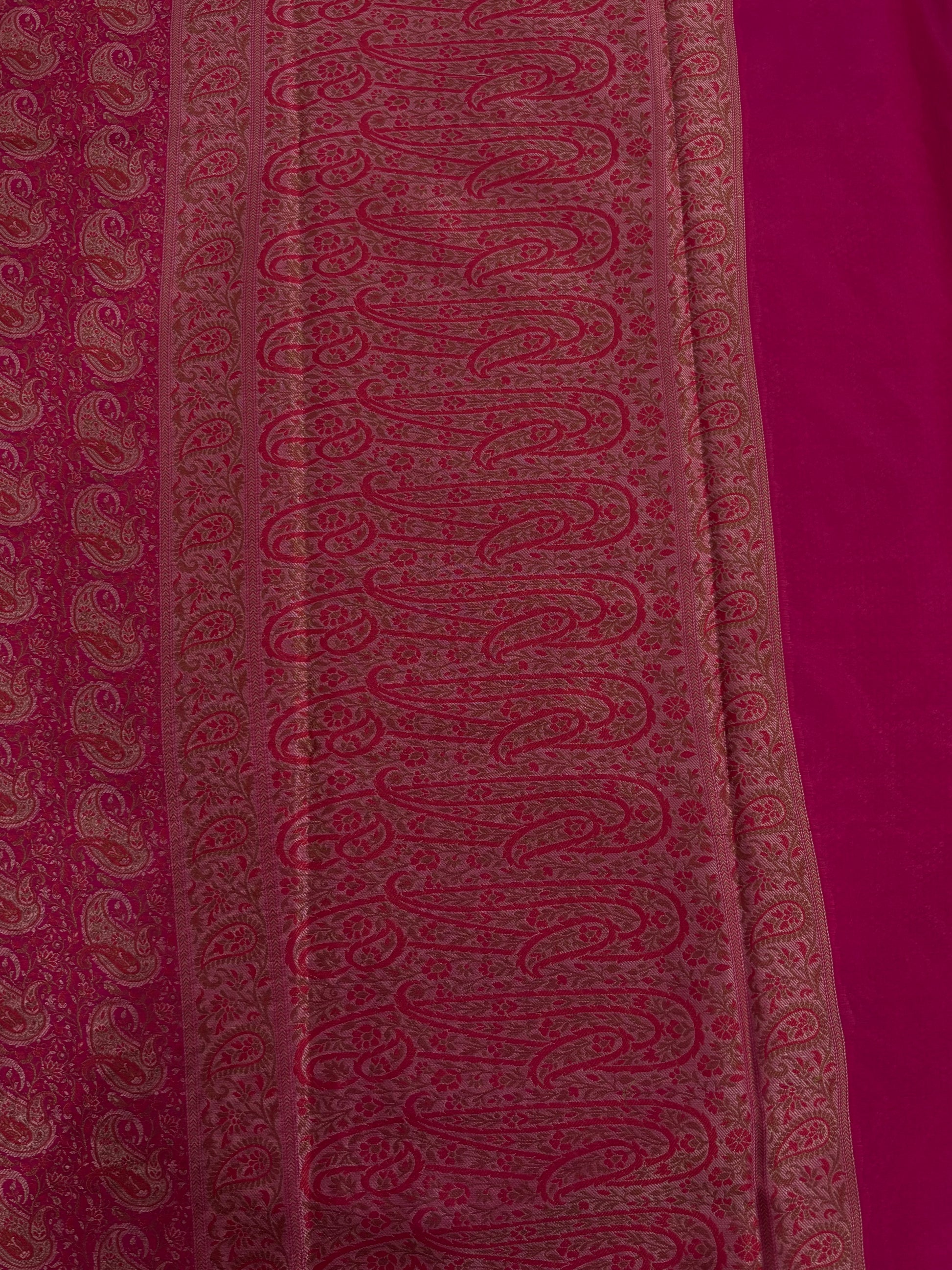 Elevate your ethnic wardrobe with this stunning pink pashmina silk saree, featuring intricately woven mango motifs throughout the fabric. Delicate woven borders frame the drape beautifully, while the ornate pallu adds a graceful finishing touch that commands attention. The luxurious pashmina silk is perfect for weddings, festivals, and special occasions.