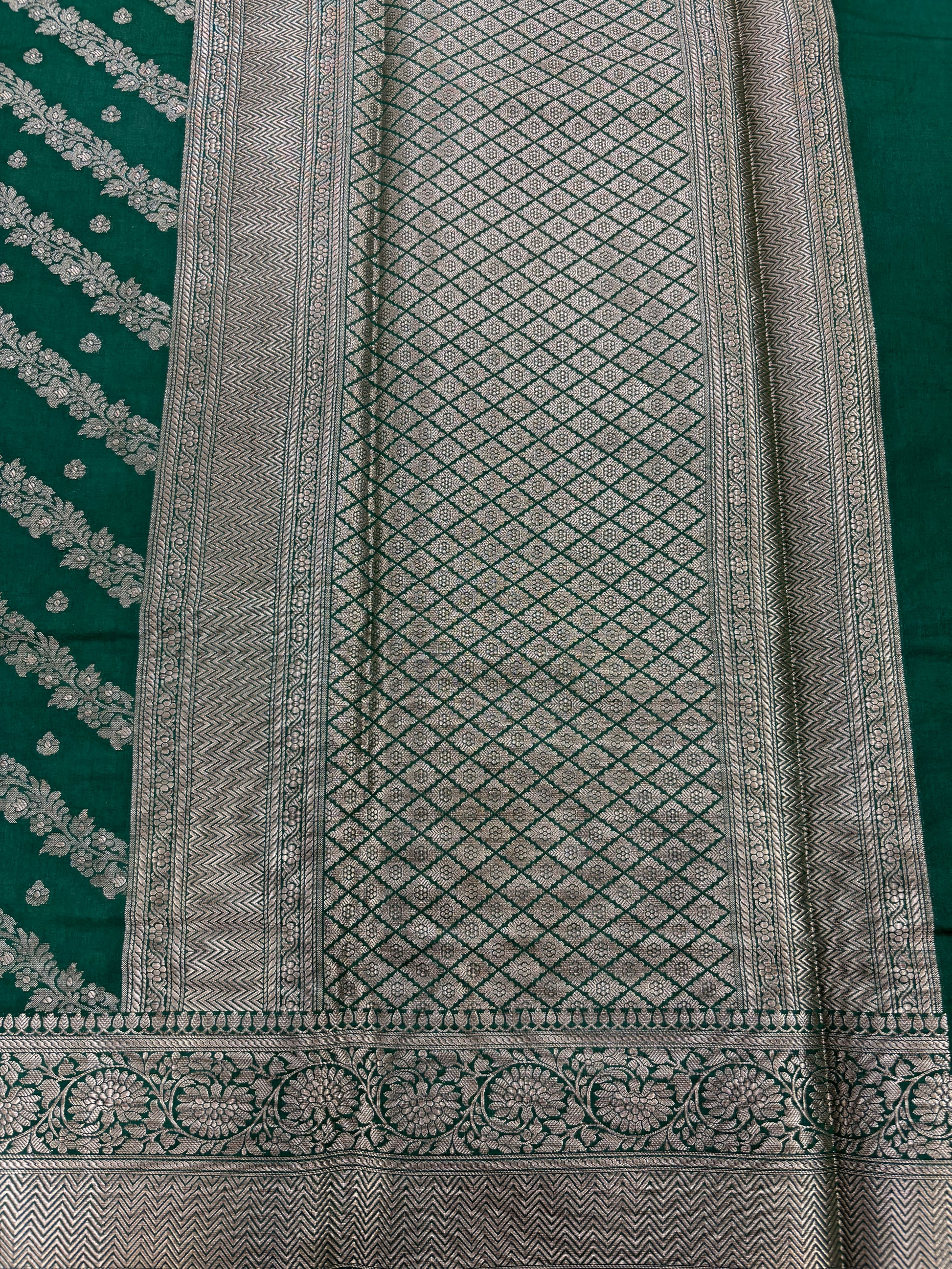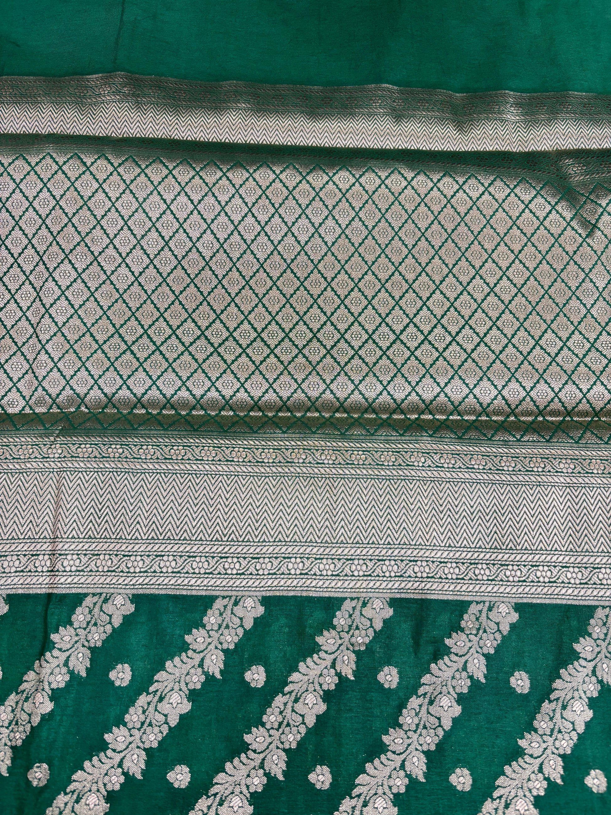 Experience the refined elegance of this raw mango silk saree. The semi-mango silk fabric drapes beautifully, while intricate zari jaal weaves create an all-over pattern that catches light with every movement. The standout feature lies in the meticulously woven border and pallu in rich green, showcasing detailed zari work that elevates the entire piece. Perfect for special occasions.