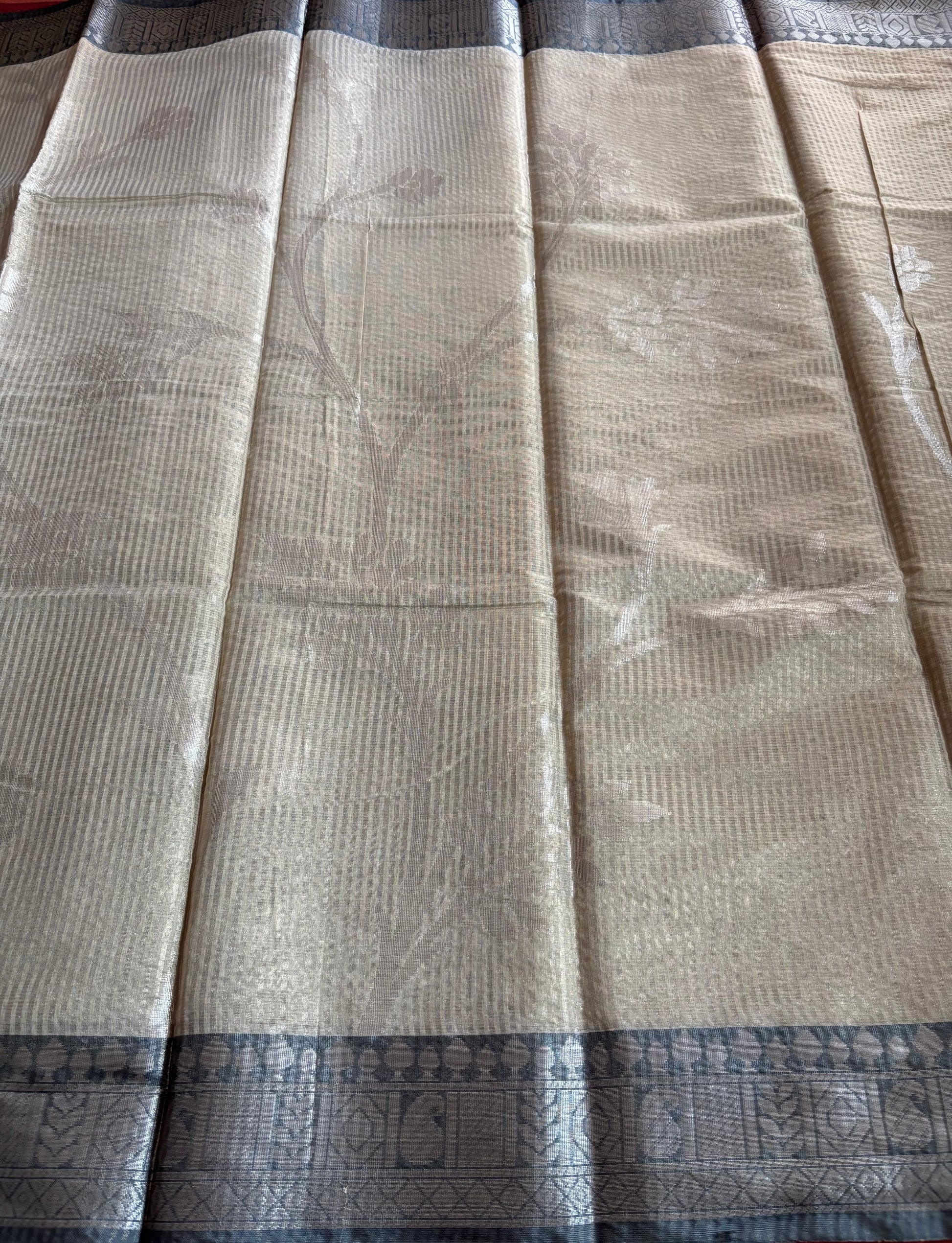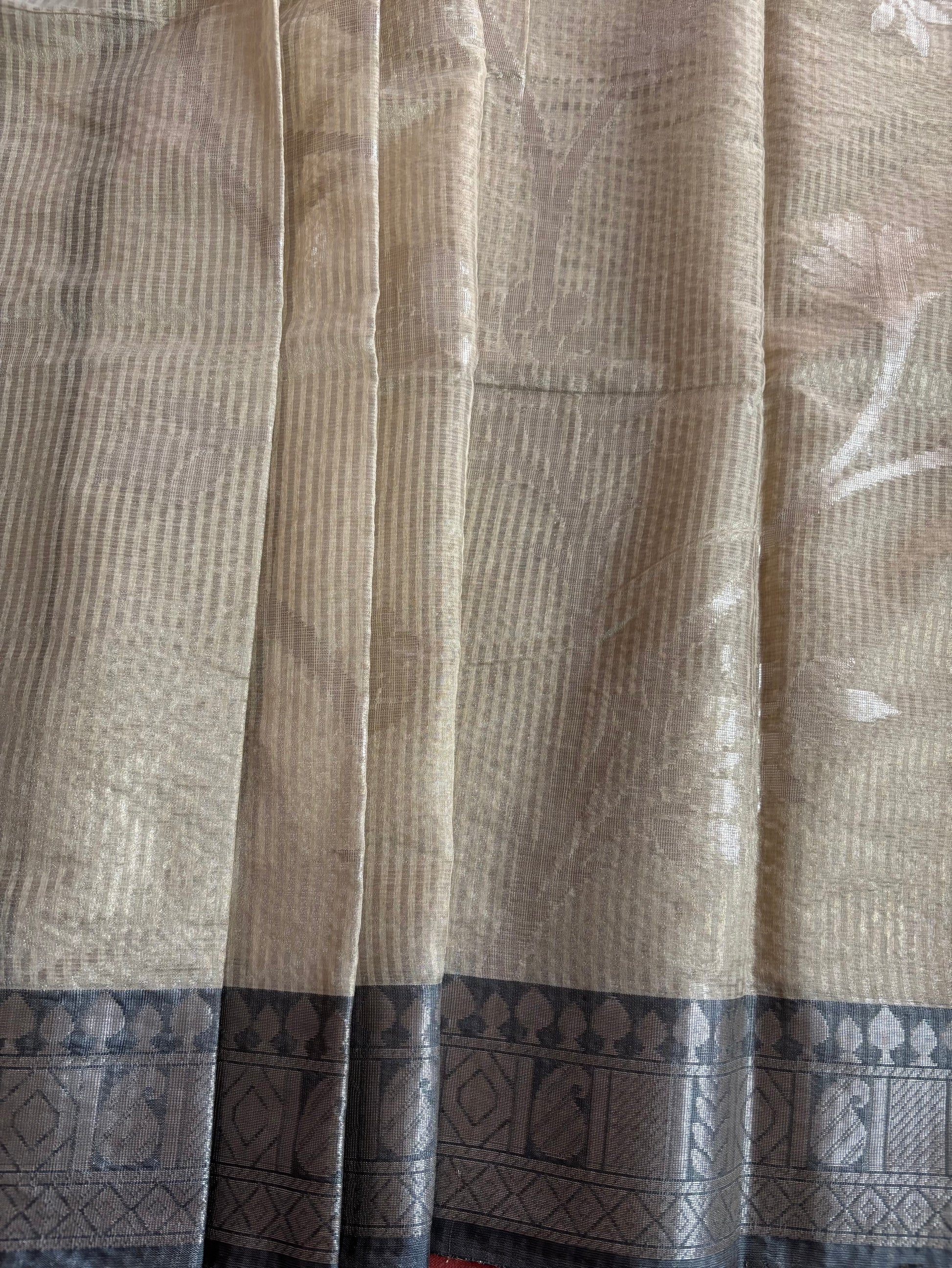 Elevate your ethnic wardrobe with this exquisite sandal-coloured tissue silk saree, featuring an intricate all-over patola weave. The striped design adds contemporary sophistication, while the grey Banarasi-woven borders and pallu deliver timeless elegance with their ornate detailing. Paired with a coordinating grey brocade blouse, this saree seamlessly transitions from festive occasions to formal gatherings.