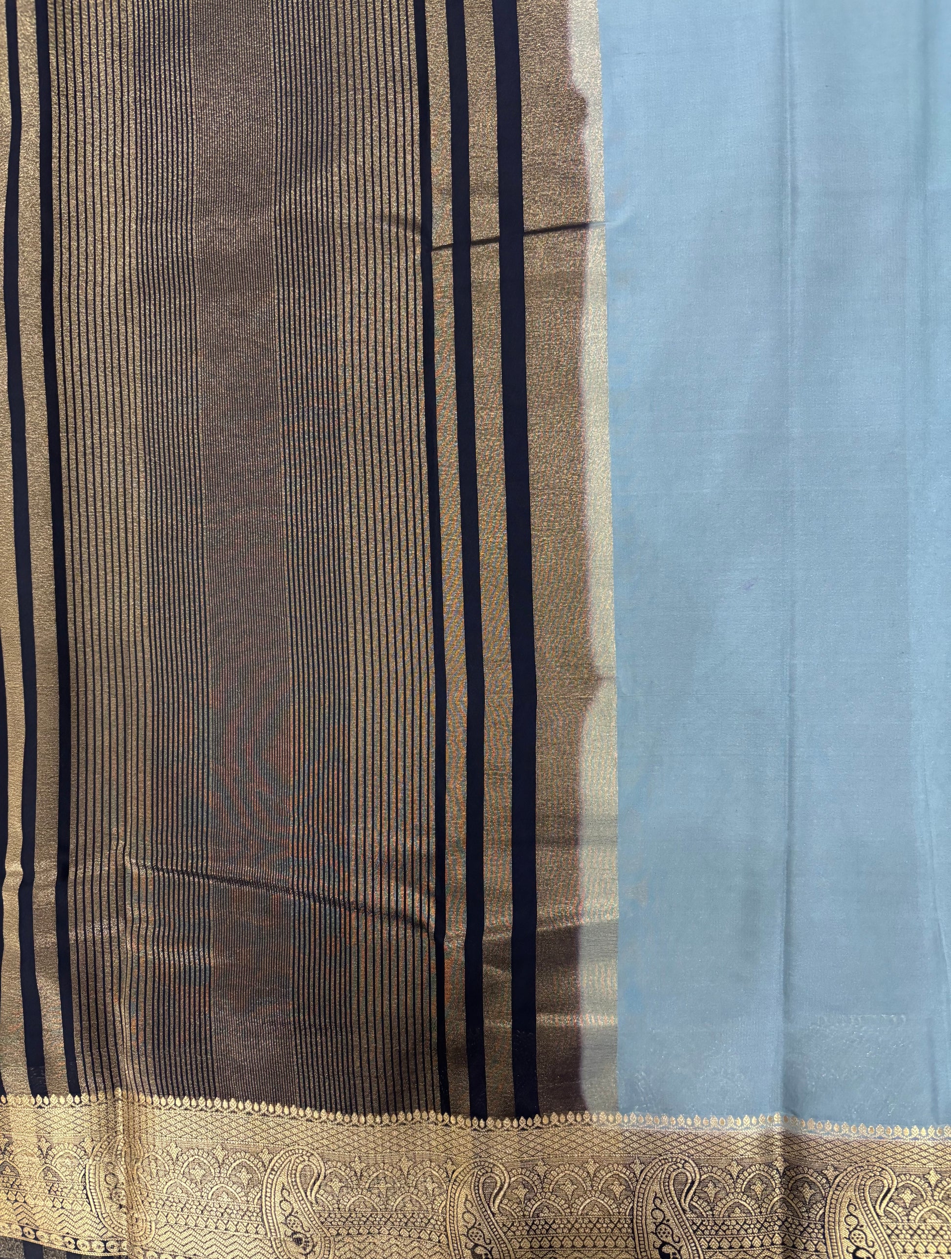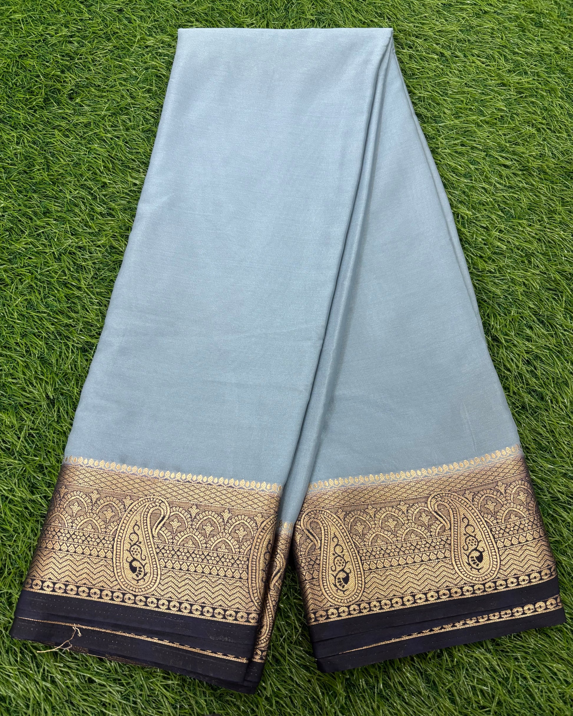 Elevate your ethnic wardrobe with this sophisticated Semi Mysore crepe saree The luxurious fabric drapes beautifully, offering comfort without compromising on elegance. Adorned with intricate golden zari borders that frame the pallu, this saree showcases a refined grey and black color palette—a timeless combination that exudes understated luxury. making it an ideal choice for festive occasions, celebrations, or formal gatherings.