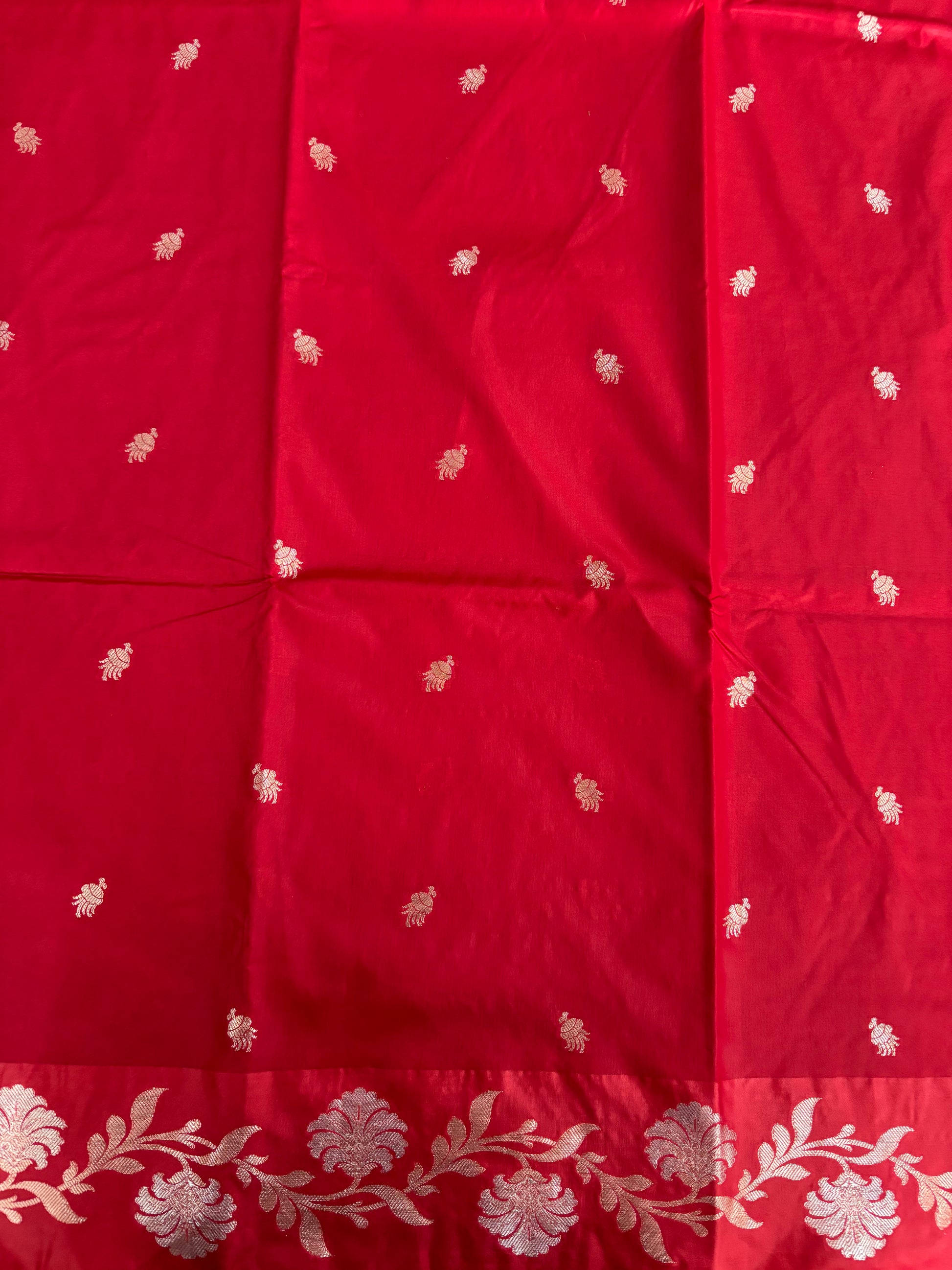Woven in soft semi-raw mango silk, this Red saree features gentle water-zari creeper designs on glowing satin borders, leading into a richly crafted pallu. Paired with a plain blouse finished with borders, it radiates a warm, refined elegance ideal for special moments.