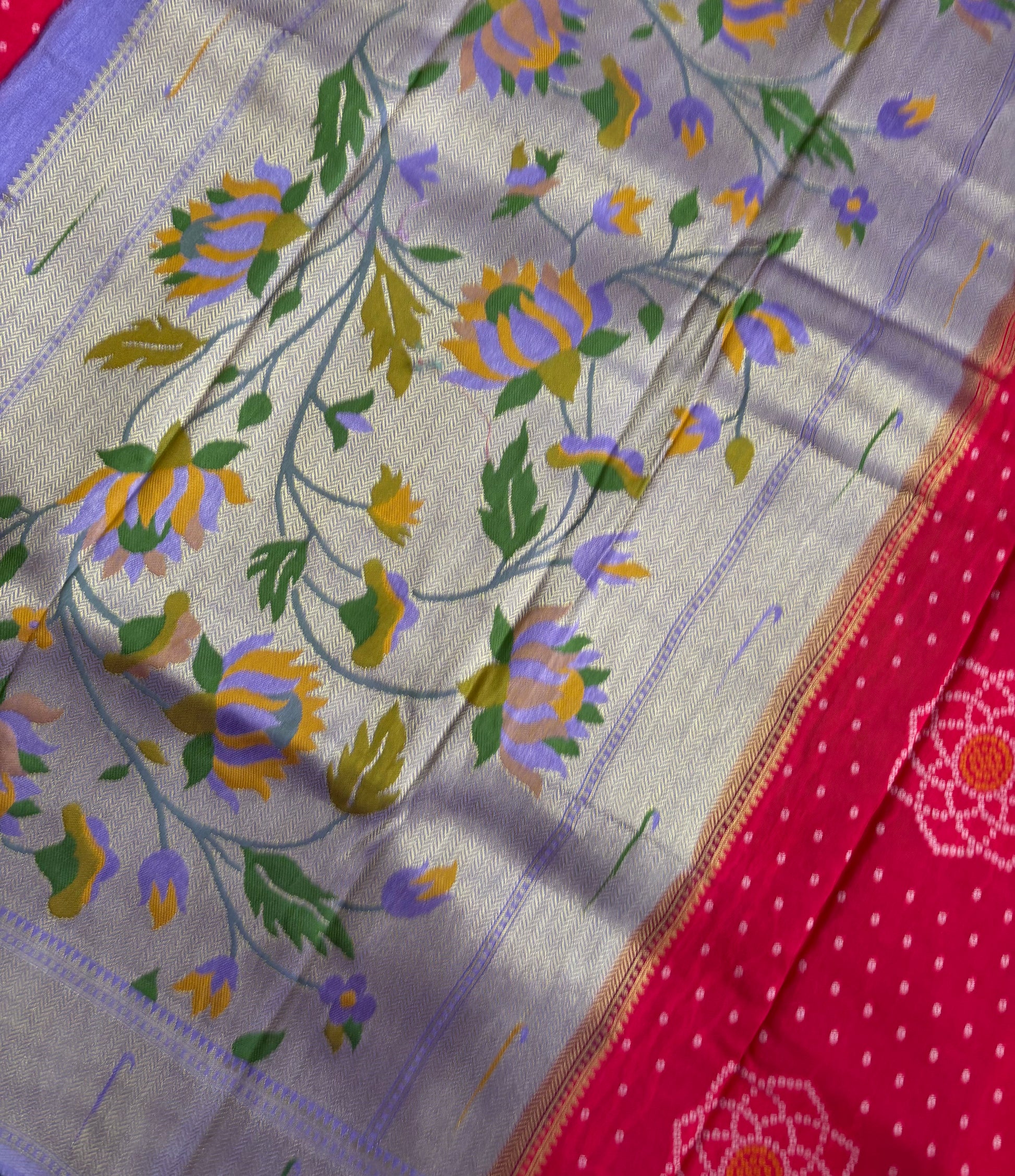 Elevate your saree collection with this exquisite viscose crepe silk creation, featuring an intricate all-over bandini floral weave that captures traditional craftsmanship. The stunning pink and lavender color combination offers versatile styling for both festive occasions and celebrations. Adorned with authentic Paithani borders and pallu, this piece showcases meticulous detailing that reflects timeless elegance. The premium viscose crepe fabric drapes beautifully while maintaining its structure.